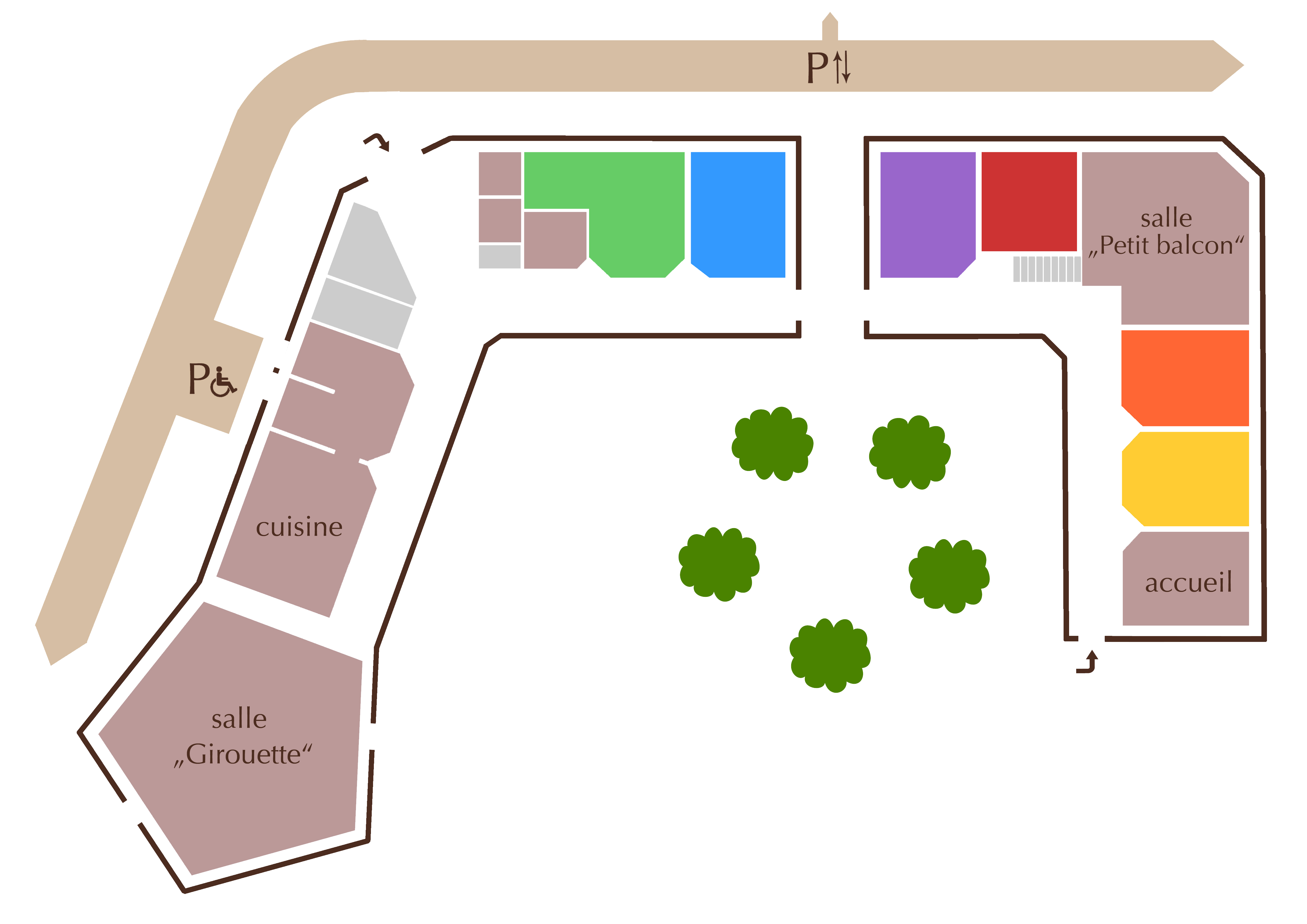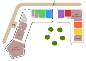 Toutes les mezzanines sont accessibles par une échelle de meunier et les chambres violette, rouge, orange et jaune disposent de sanitaires en commun au rez-de-chaussée en bas.